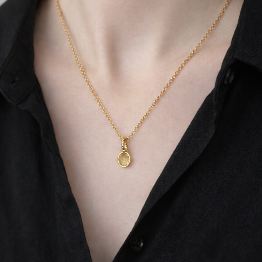 Sitrin taşı; bolluk, şans, bereket ve pozitif enerjisi olan özel bir kristaldir. Bu özel parça, hem günlük stiline minimal ama etkileyici bir dokunuş katmak hem de enerjini yükseltmek için 925 ayar gümüş üzerine altın kaplama ile tasarlandı.