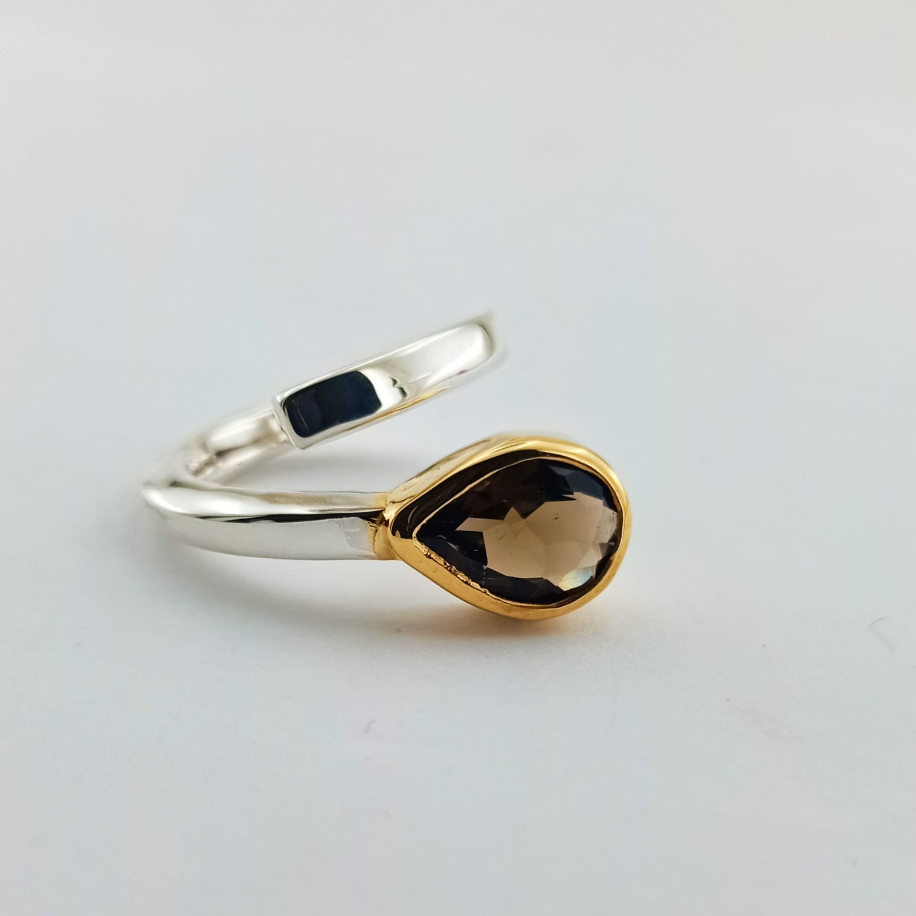 Zarif damla formuyla tasarlanan bu yüzük, koruyucu ve arındırıcı enerjisiyle bilinen dumanlı kuvars taşıyla hayat buldu. Altın detaylarla vurgulanan modern tasarımı, hem günlük şıklığa hem de özel anlara sofistike bir dokunuş katıyor.